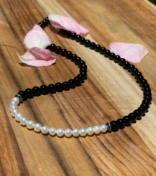 20 inch Shiny Onyx Beads and Freshwater Pearl Necklace